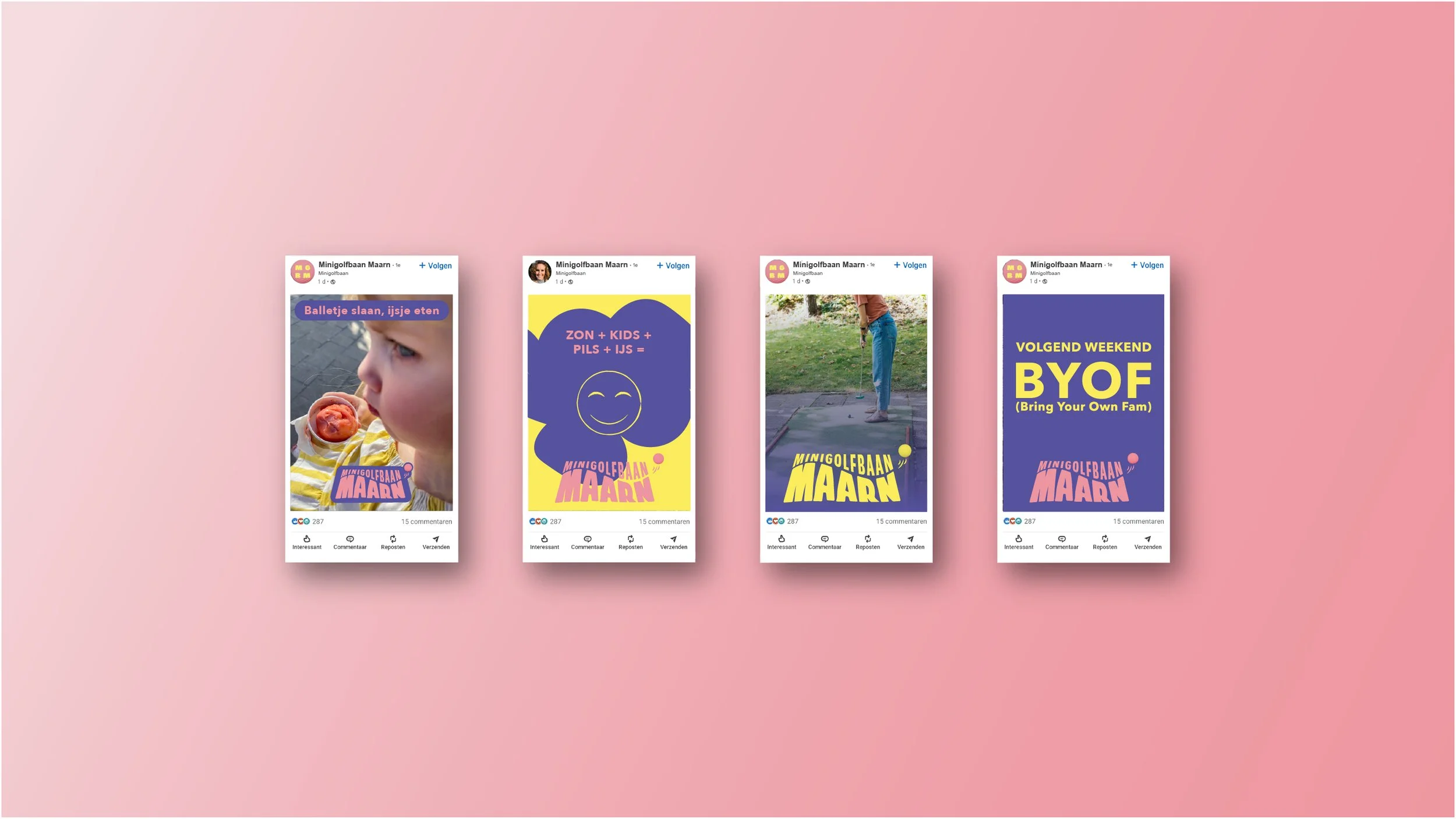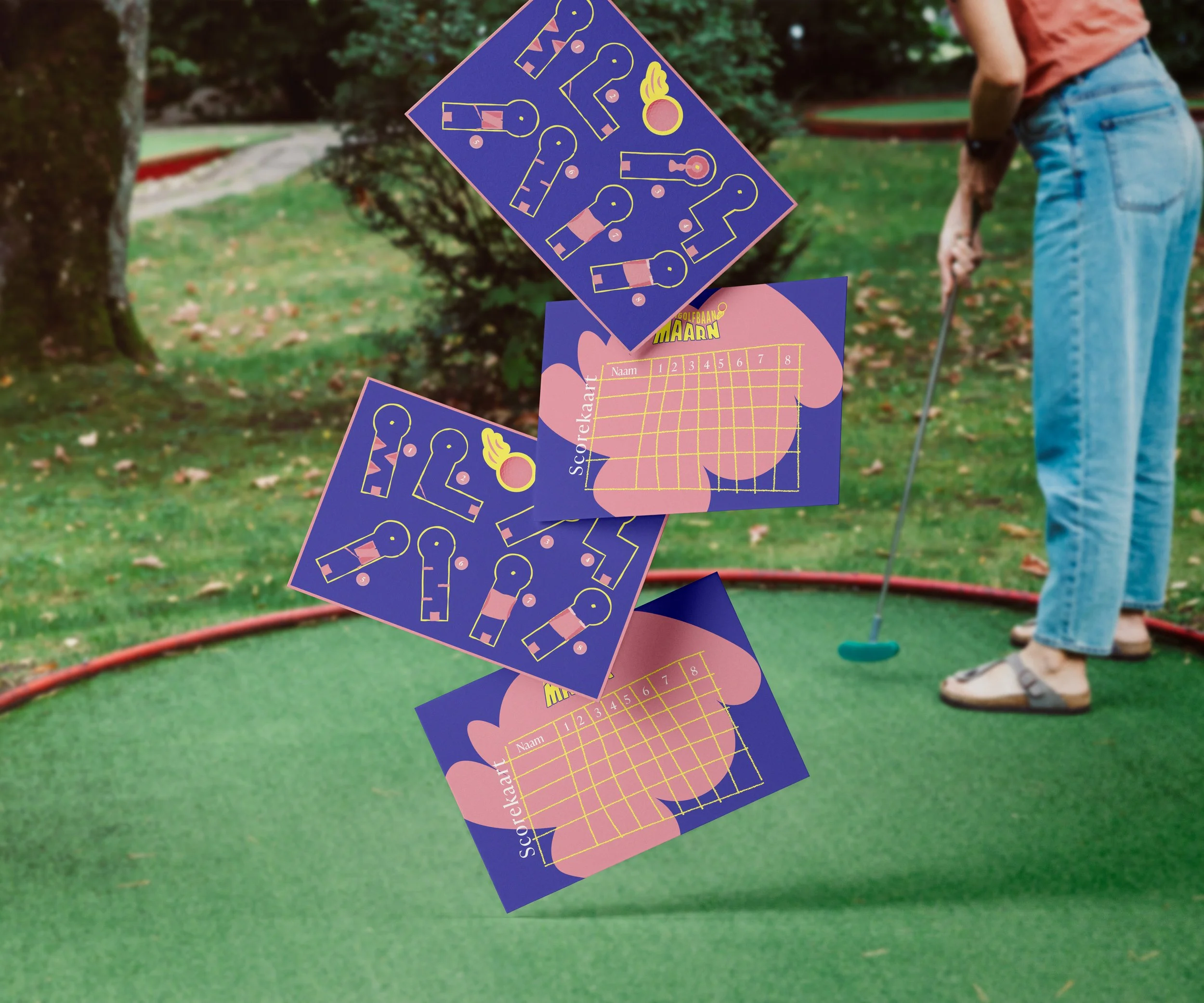 Als opdracht in de cursus Graphic Design van Reducations heb ik een huisstijl ontwikkeld voor een hypothetische minigolfbaan in Maarn. Deze golfbaan bestaat al jaren en heeft ook al jaren weinig aan zijn identiteit gedaan. Nu willen ze beter aansluiten bij de nieuwe generatie ouders en kinderen die vanuit de stad naar Maarn verhuizen. Met deze huisstijl verwacht ik nieuwe ouders met jonge kinderen aan te trekken door het zomerse en speelse karakter.